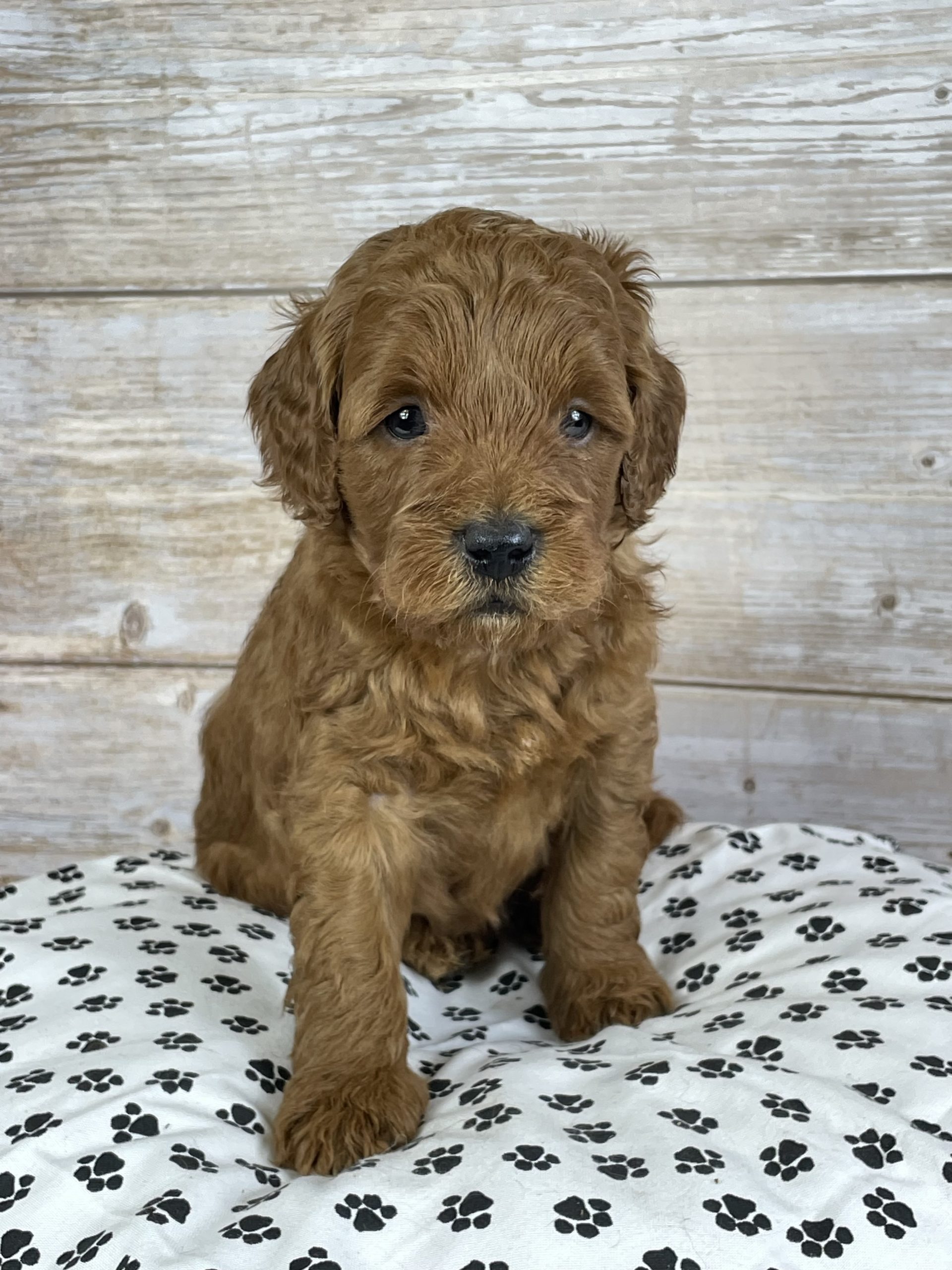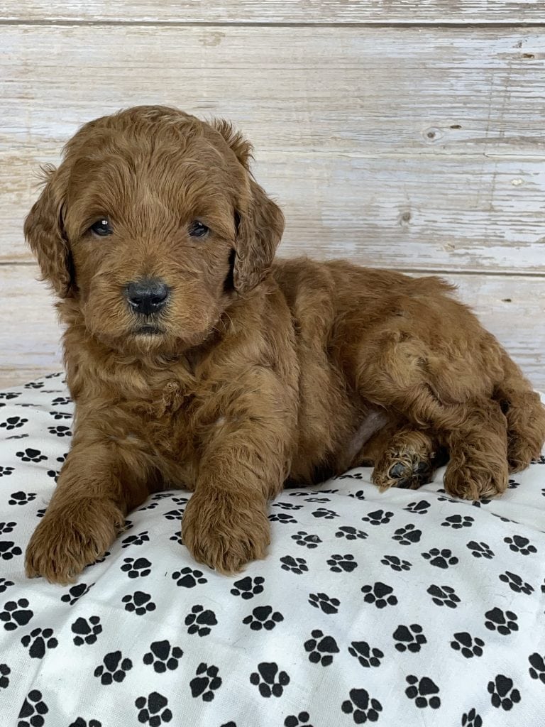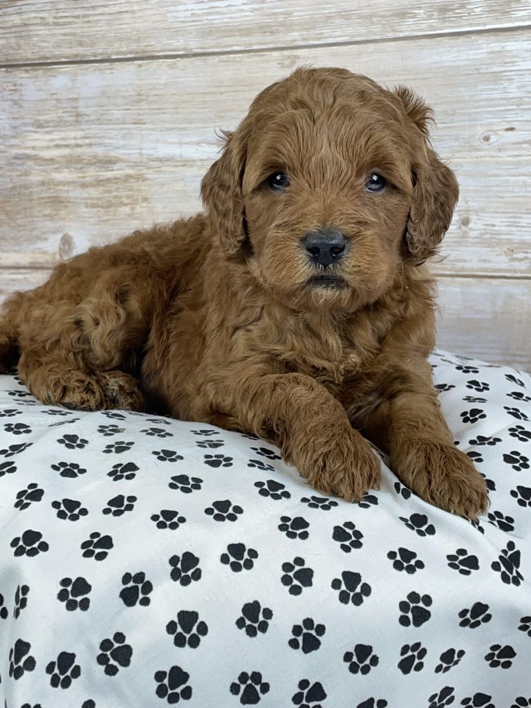 Meet Asher — a gorgeous Goldendoodle boy with a rich, dark red wavy coat and the sweetest personality you could ever ask for! With his soft, fluffy curls and warm, expressive eyes, Asher has that irresistible teddy bear look that everyone falls in love with instantly.