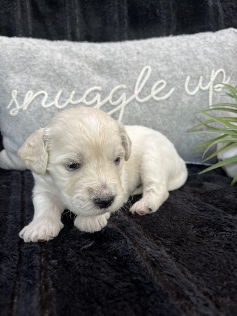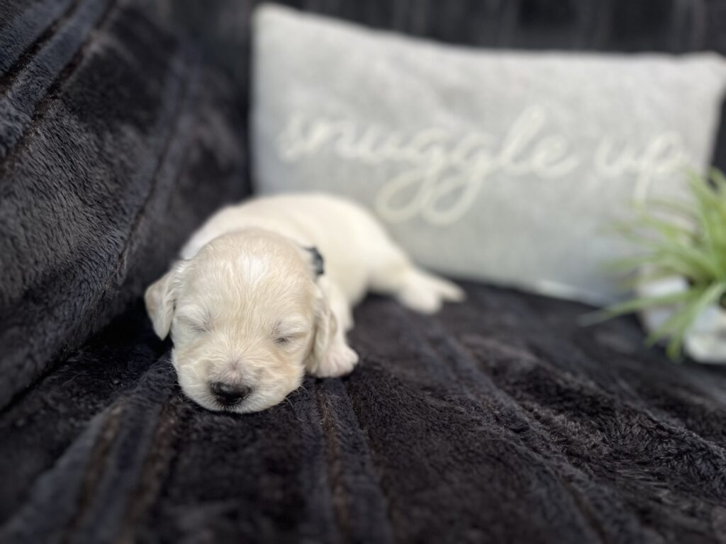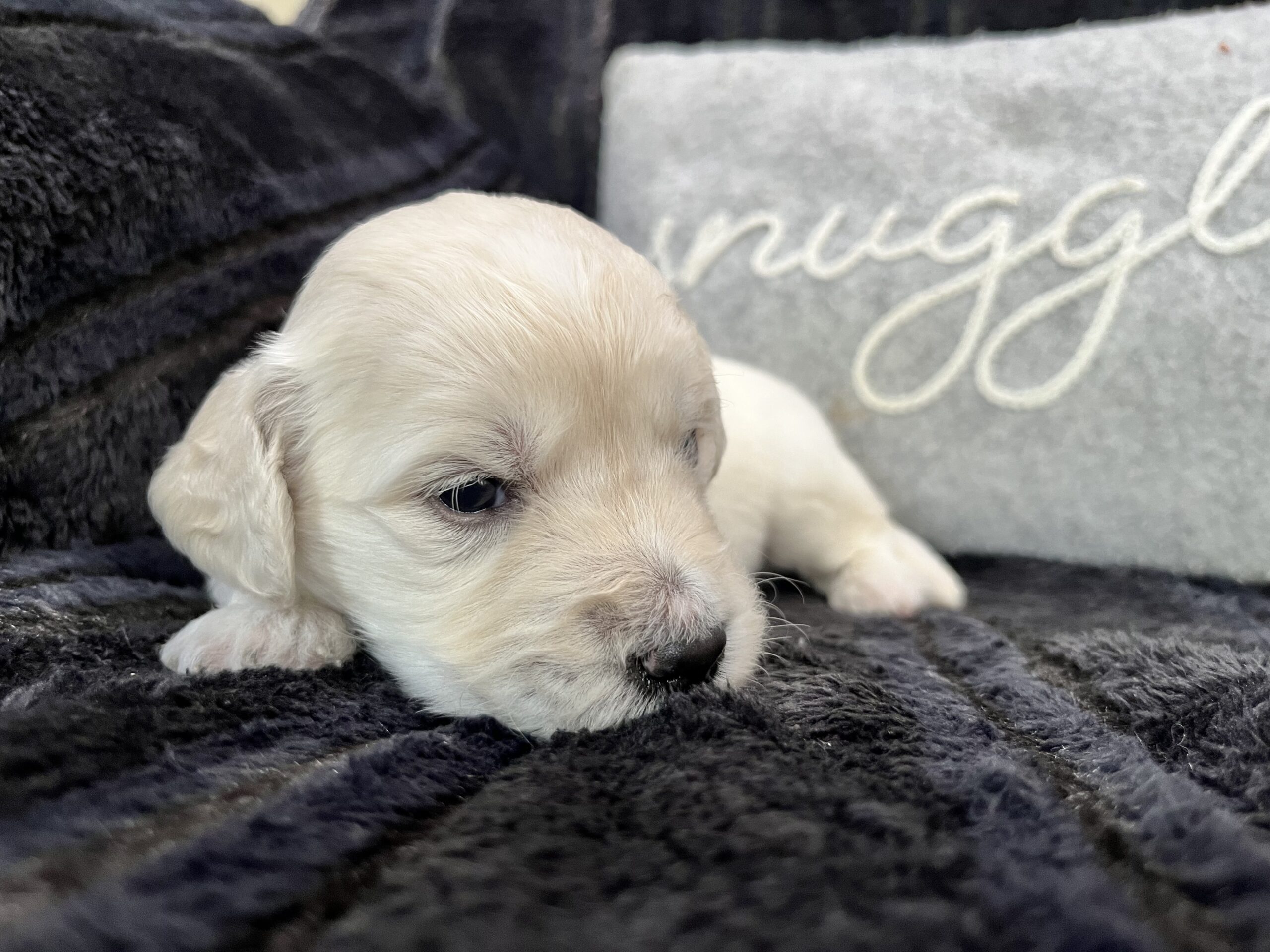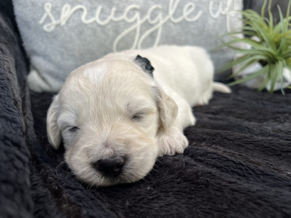 Elliott is a mostly white Goldendoodle puppy with a fluffy, teddy bear coat and the sweetest laid-back personality. Unlike his more energetic siblings, Elliott prefers the cozy side of life—snuggling close, soaking up gentle pets, and quietly watching the world go by. He’s calm, affectionate, and endlessly loving, making him the perfect cuddle buddy. With his soft nature and snuggly demeanor, Elliott is the kind of puppy who makes every moment feel warm and comforting. Although he is the smallest of his litter, he can easily keep up with his big, charming personality!