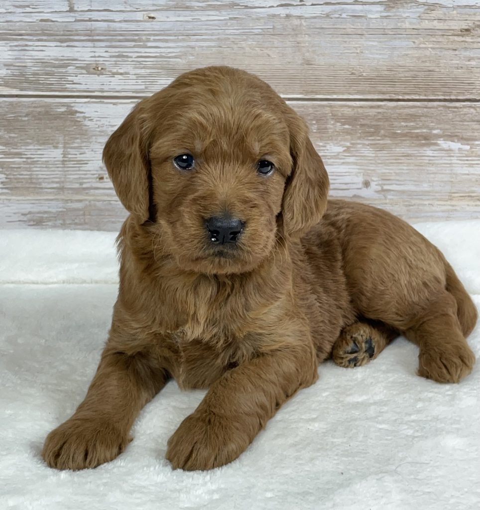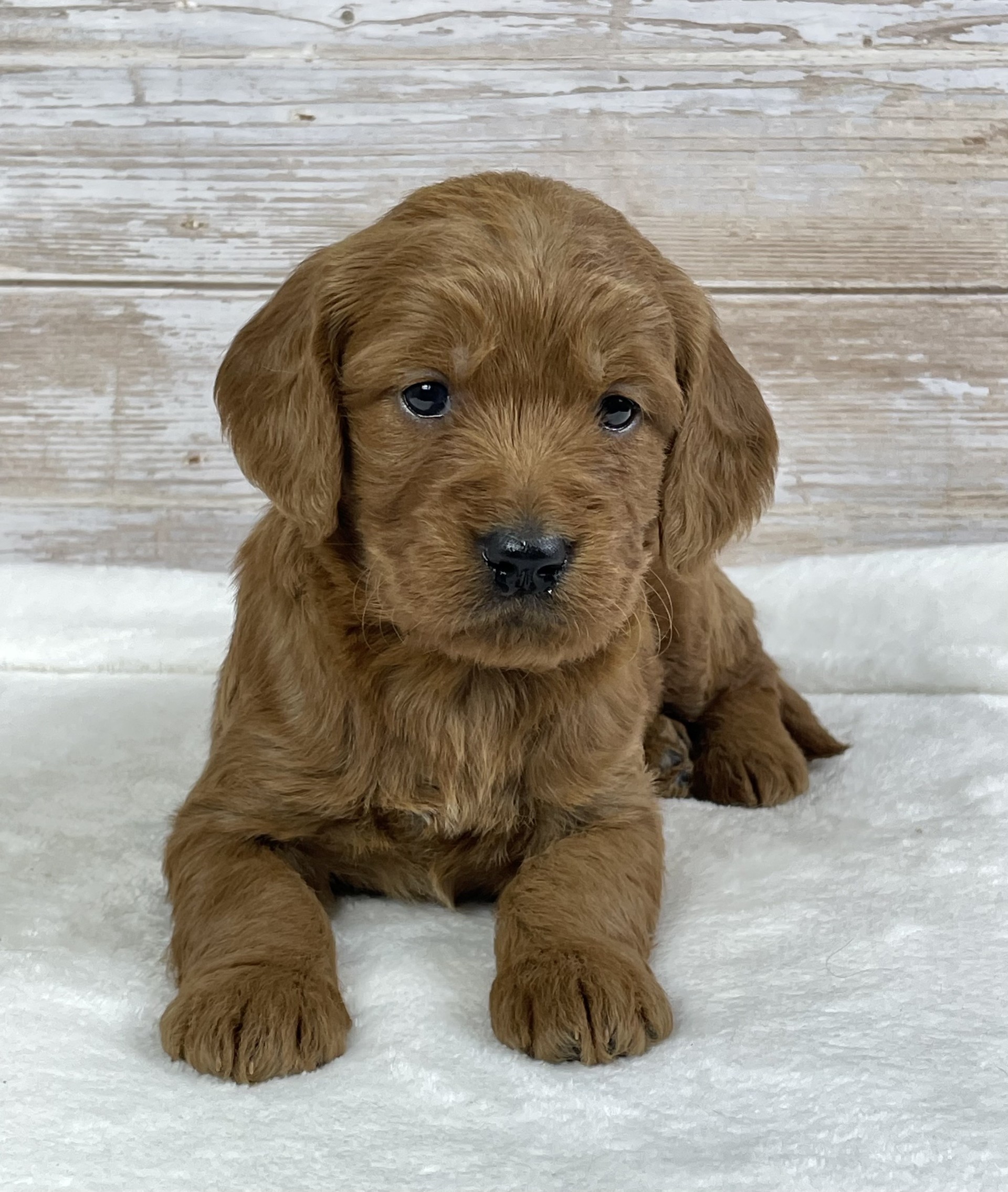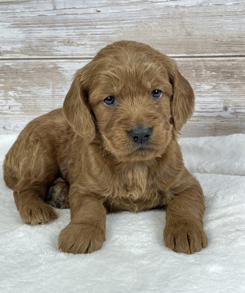 Meet Hazel, a beautifully structured Goldendoodle puppy with big floppy ears and a stunning deep red, soft wavy coat. Hazel has a fun, happy personality and loves to play just as much as she enjoys cuddle time. She’s confident, affectionate, and full of charm, making her a joy to be around. Raised in a loving environment and well-socialized, Hazel has a wonderful temperament and is ready to become a cherished companion. With her gorgeous looks and lively, loving nature, Hazel is sure to steal hearts wherever she goes. 💕