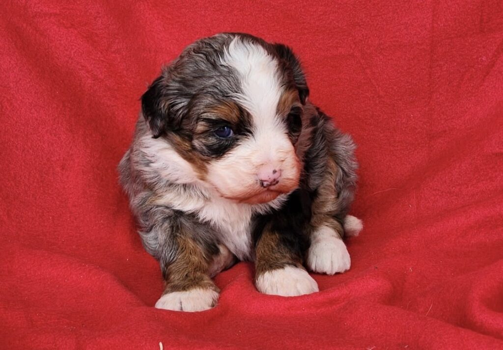 Meet Lacey, an absolutely stunning mini Bernedoodle with a gorgeous blue merle coat that makes her truly one of a kind. Lacey has a sweet, affectionate personality and loves being around people. She’s playful yet gentle, enjoys cuddles, and is always happy to share her loving nature. With her charming looks, friendly temperament, and intelligent Bernedoodle traits, Lacey will make a wonderful companion for a family or individual looking to add a loyal, loving puppy to their home.