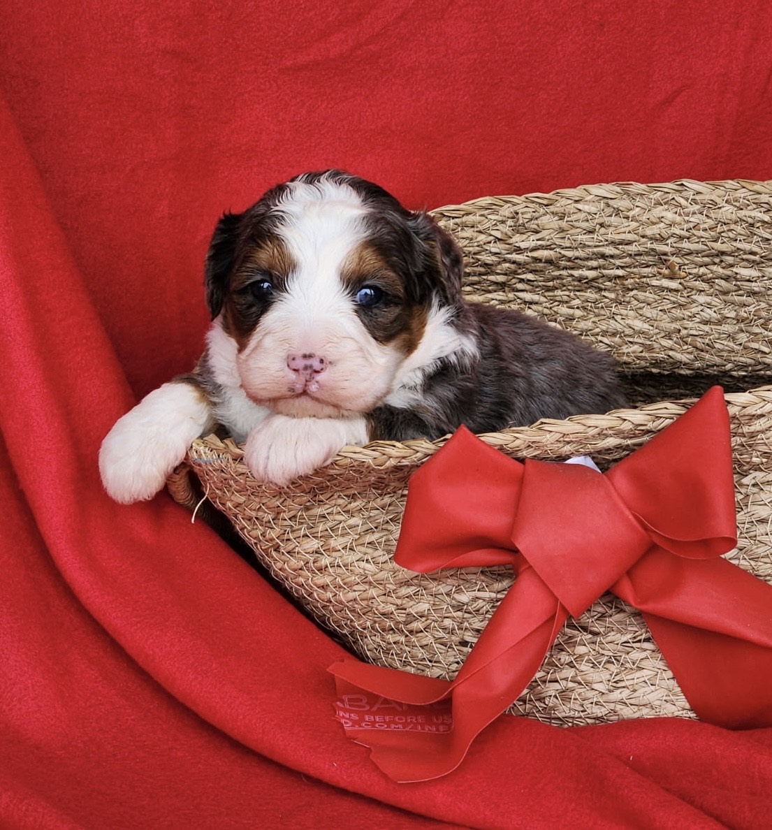 Meet Lacey, an absolutely stunning mini Bernedoodle with a gorgeous blue merle coat that makes her truly one of a kind. Lacey has a sweet, affectionate personality and loves being around people. She’s playful yet gentle, enjoys cuddles, and is always happy to share her loving nature. With her charming looks, friendly temperament, and intelligent Bernedoodle traits, Lacey will make a wonderful companion for a family or individual looking to add a loyal, loving puppy to their home.
