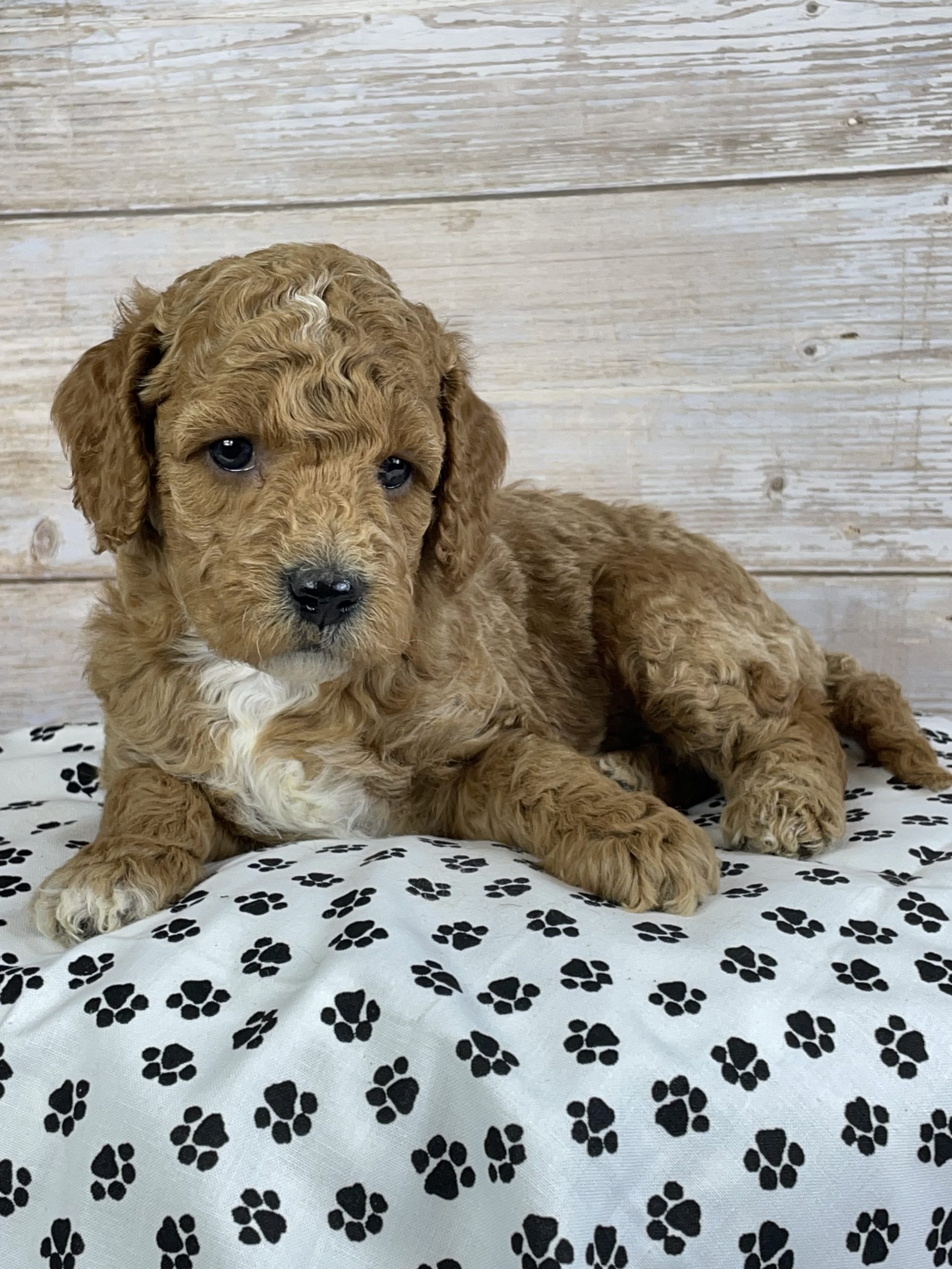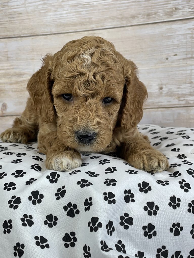 Meet Lily — a precious Goldendoodle puppy with a soft apricot coat beautifully highlighted by delicate white markings that make her absolutely irresistible!