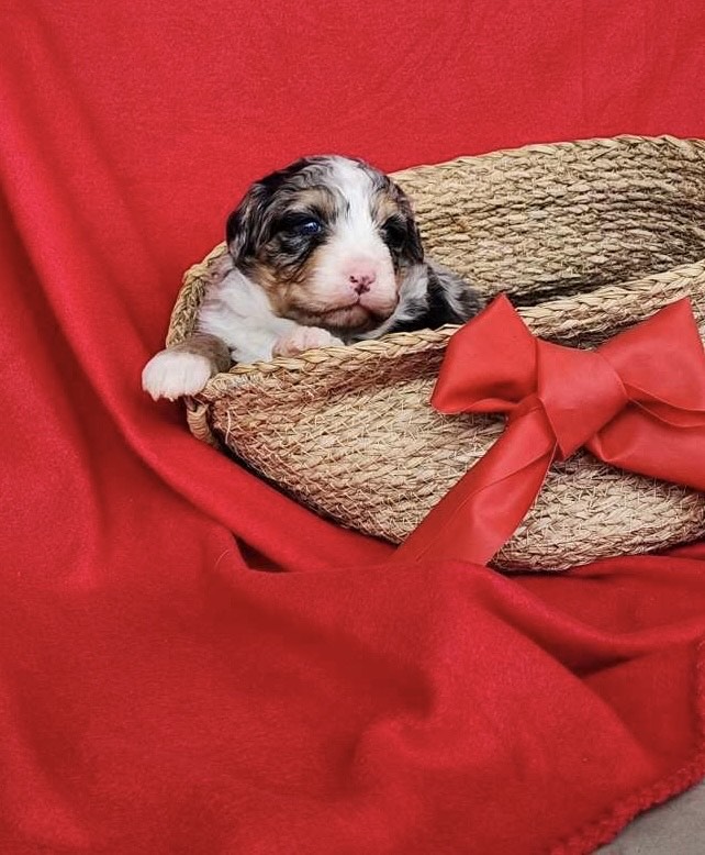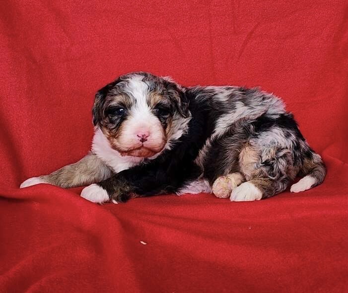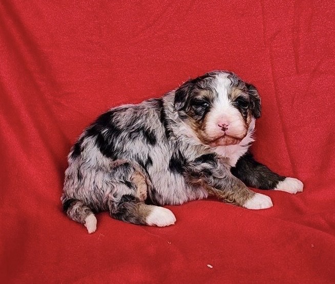 Meet Lucy, a beautiful mini Bernedoodle with a stunning blue merle coat that’s sure to steal your heart. Lucy has a sweet, loving personality and a gentle, friendly nature that makes her a joy to be around. She loves attention, enjoys playtime, and is always ready for snuggles. Intelligent, affectionate, and eager to please, Lucy will make a wonderful companion for families or individuals looking for a loyal and loving puppy to welcome into their home.