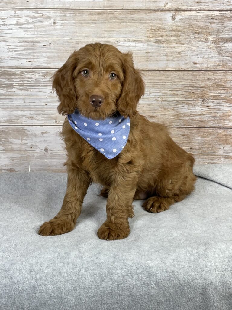 Milo is an absolutely adorable Mini Goldendoodle with soft red wavy hair, big lovable ears, and the cutest chocolate-colored nose. His unique greenish-gray eyes sparkle with sweetness and curiosity, and his gentle personality shows just how big his heart truly is. Milo is full of love and charm, making him the perfect companion for a lucky forever family.