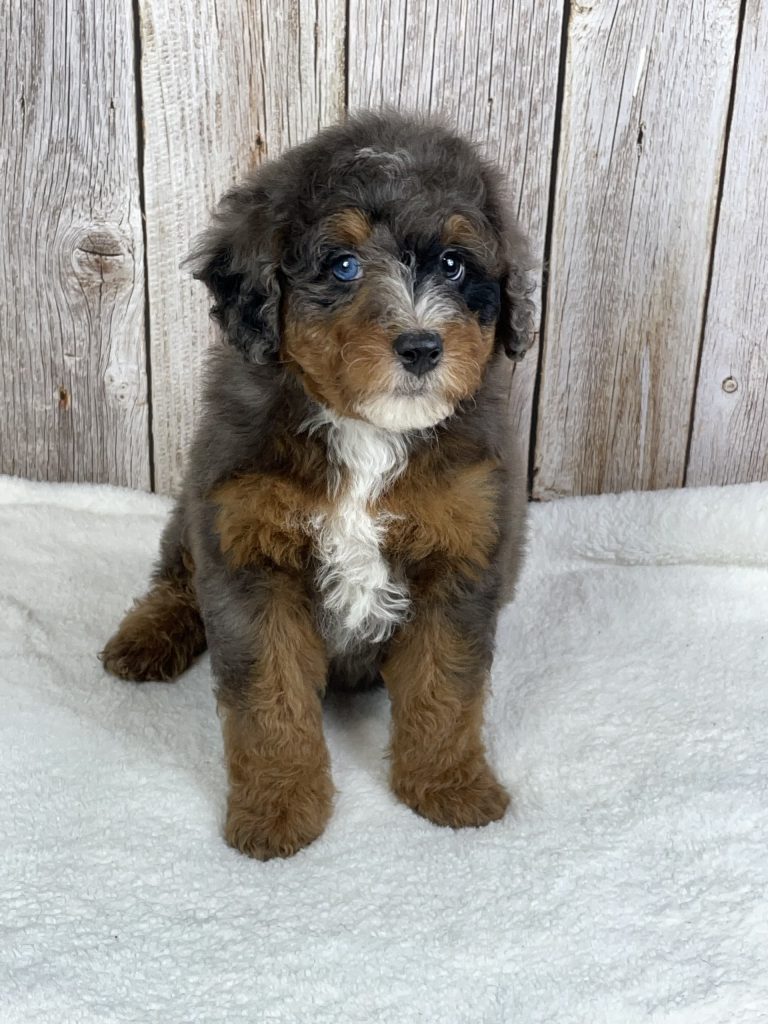 Meet Mocha, an absolutely stunning Mini Bernedoodle with a rare and eye-catching chocolate merle coat that truly sets him apart. His rich coloring is beautifully blended, giving him a one-of-a-kind look that turns heads everywhere he goes. Mocha has a sweet, affectionate personality and loves being around people, making him a wonderful companion for families or individuals alike.
