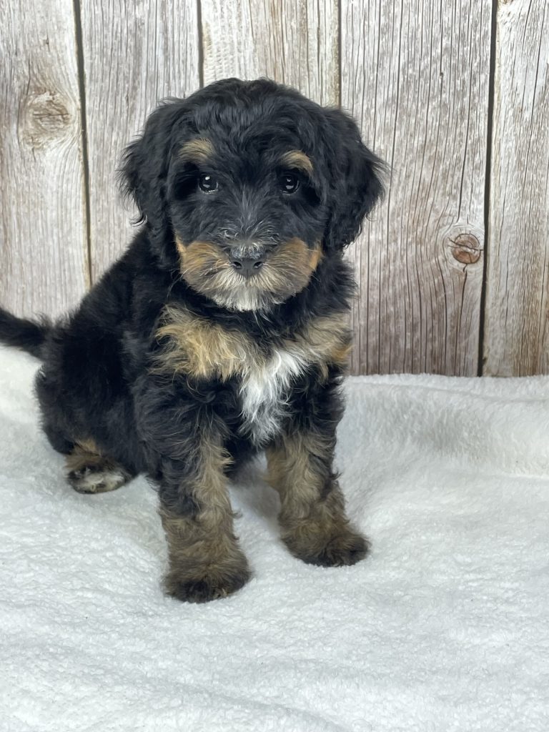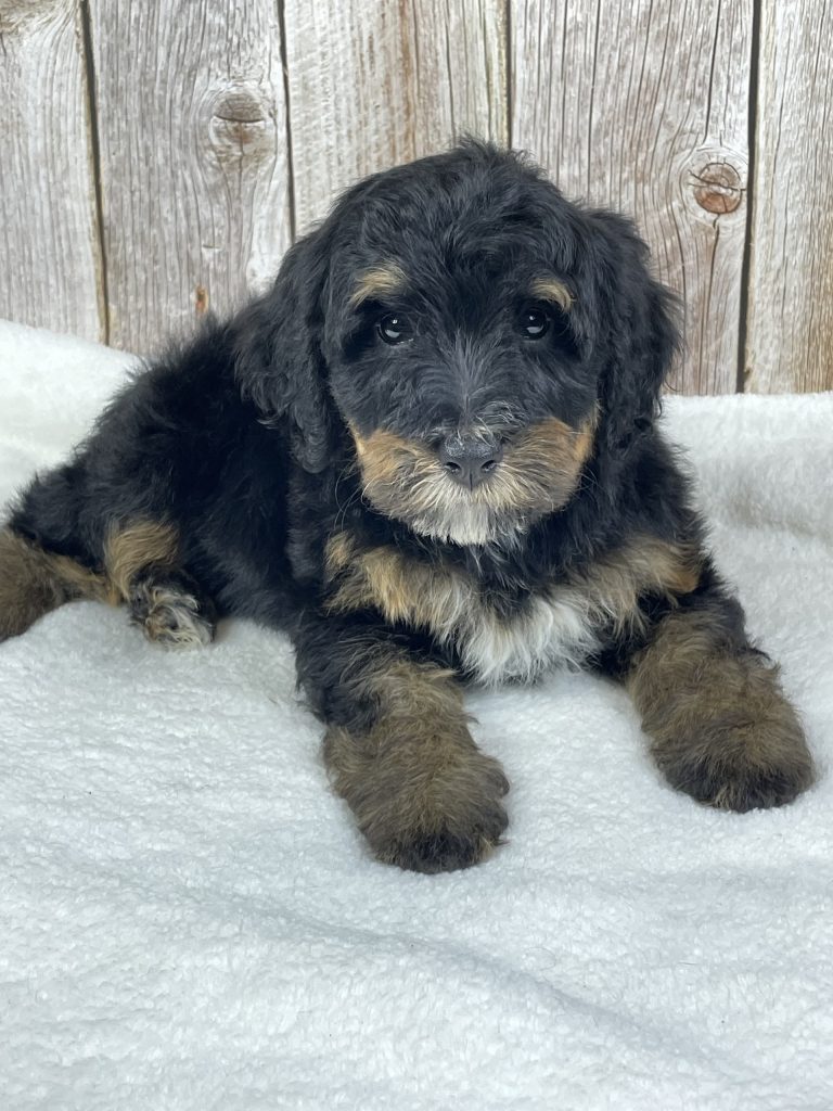 Meet Moose, a stunning Bernedoodle with a rich black coat, beautiful dark tan trim, and an adorable little white strip that gives him extra character. He has a striking, classy look that turns heads, paired with a sweet and gentle personality that makes him easy to love. Moose is affectionate, friendly, and enjoys being around people, making him a perfect fit for a family or an individual looking for a loyal companion. Whether it’s playtime or quiet cuddle moments, Moose is happiest when he’s with his people and ready to become a cherished part of his forever home. 🐾🖤