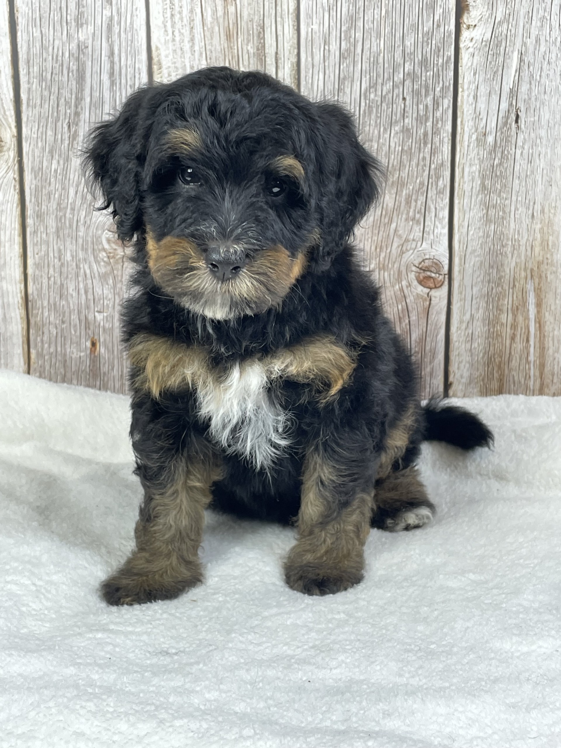 Meet Moose, a stunning Bernedoodle with a rich black coat, beautiful dark tan trim, and an adorable little white strip that gives him extra character. He has a striking, classy look that turns heads, paired with a sweet and gentle personality that makes him easy to love. Moose is affectionate, friendly, and enjoys being around people, making him a perfect fit for a family or an individual looking for a loyal companion. Whether it’s playtime or quiet cuddle moments, Moose is happiest when he’s with his people and ready to become a cherished part of his forever home. 🐾🖤