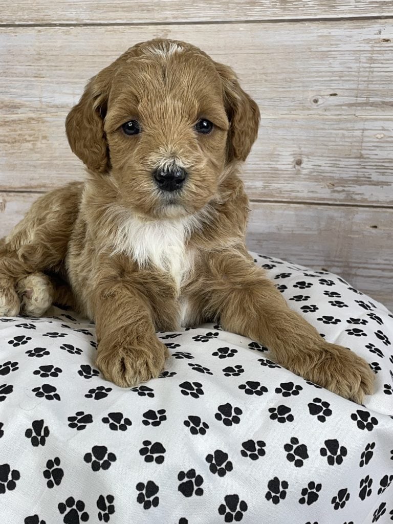 Meet Rose — the sweetest Goldendoodle puppy with a soft, wavy apricot coat beautifully accented by delicate white markings that make her absolutely enchanting!